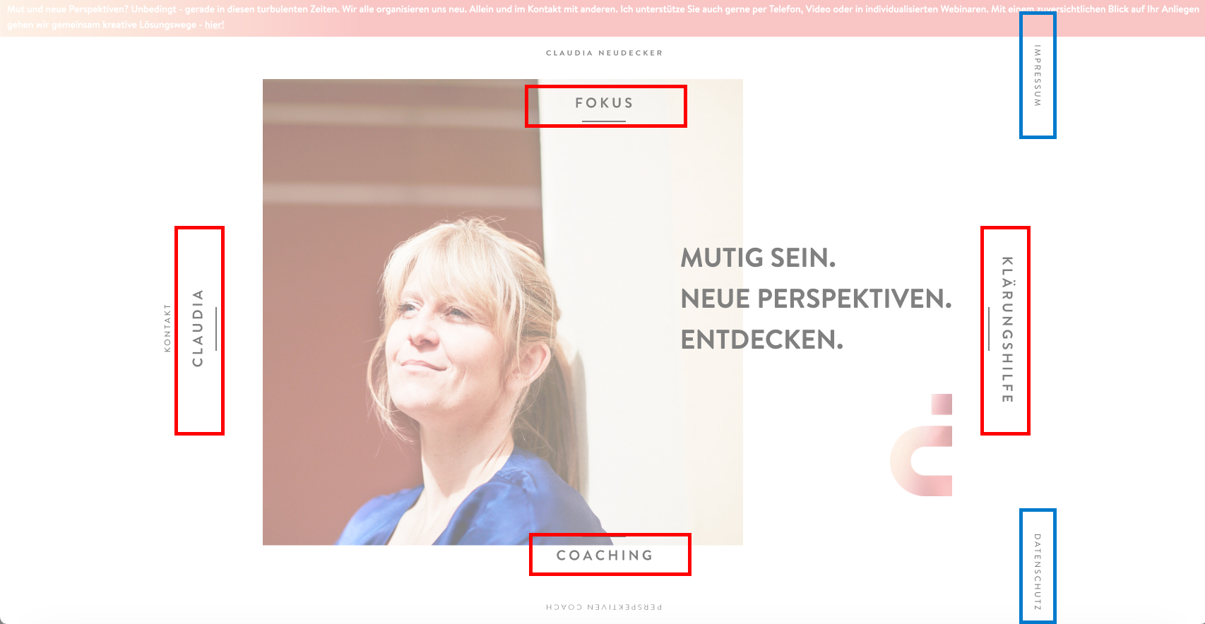 Des Weiteren sind auf jeder Seite der Website sowohl Datenschutz- als auch Impressum-Links sind am rechtn rand vor zu finden. Die Navigation auf der Seite ist eigenartig, da sie sich von anderen Webseiten unterscheidet. Die Navigationspunkte werden jeweils an der jeweiligen Redenden dargestellt.
